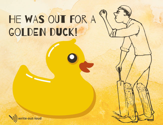 To be out for 'a duck' means the batter got out without scoring. Out for 'a golden duck' means to be out on the first ball of an over. (An over is a set of six consecutive balls (bowls) from a bowler.)